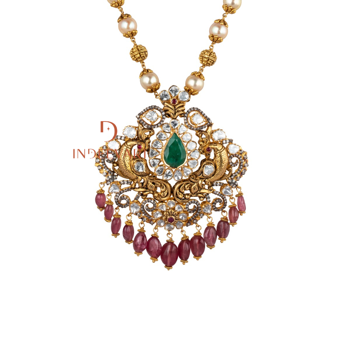 Victorian Rose Garden Polki Necklace with Coral & Emerald Drops